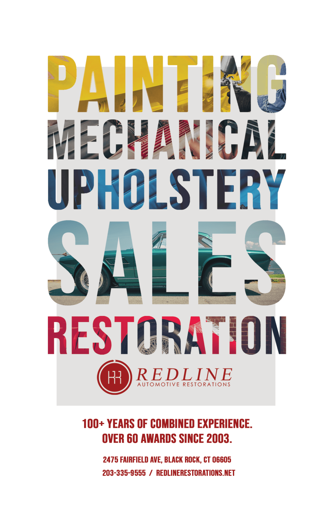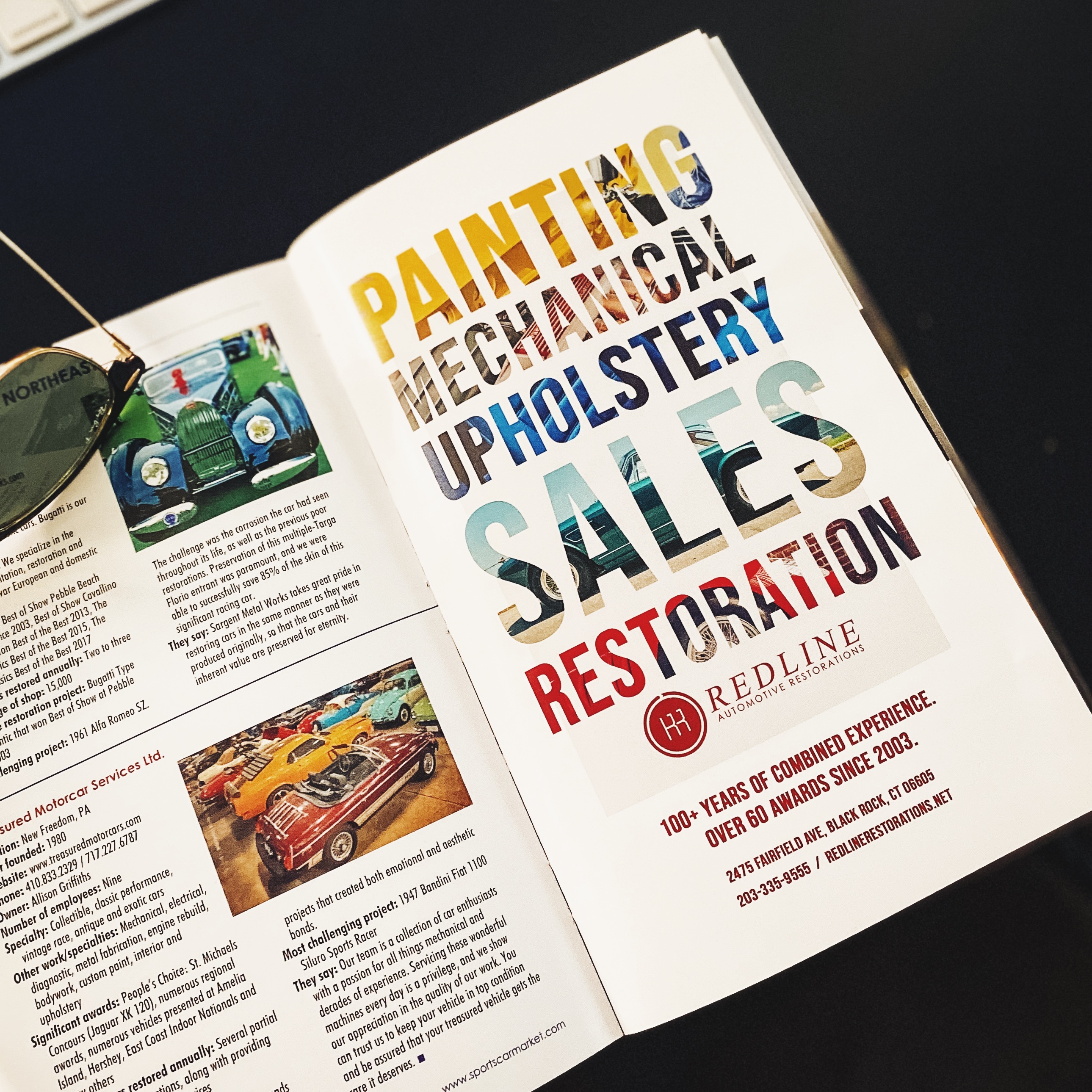 Redline Restorations is a restorations facility with a slew of in house capabilities. To market this to the public, it was known that Redline needed to stand out from the rest of the ads found in Sports Car Market. These ads are typically black background with a few images of cars and a big logo at the top of the page. Instead, I decided to use text as images and write out the most popular restoration phrases searched and use colorful images to fill the shape of the text accordingly.